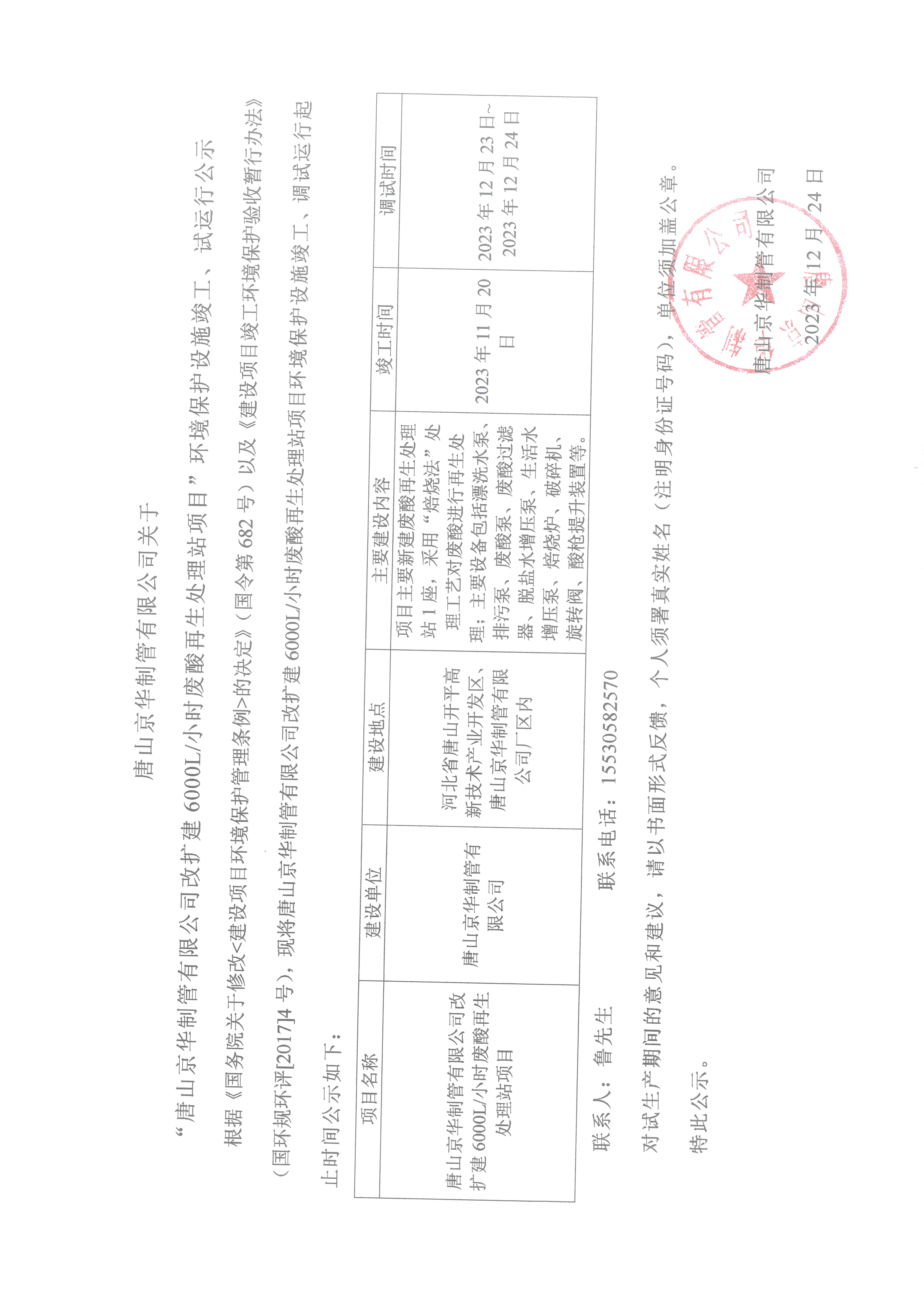 开云网关于“开云网改扩建6000L每小时废酸再生处理站项目”环境保护设施竣工、试运行公示