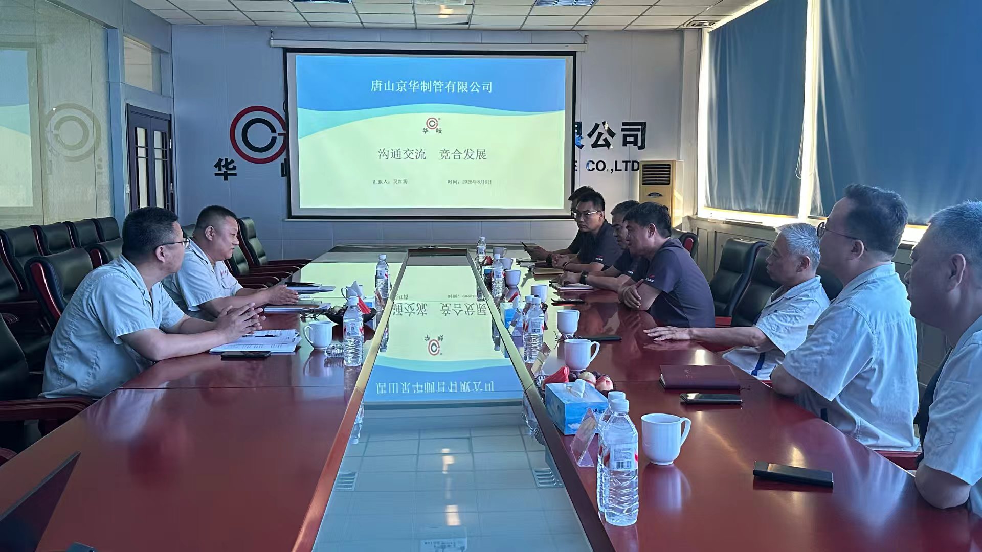 2025年8月6日,唐山正元管业有限公司总经理李茂华、迁安正大通用钢管有限公司总经理文国强分别携销售主管人员应邀莅临唐山京华。公司总经理温朝江、供销副总胡武和销售主管人员接待并陪同,三方就当前焊接钢管行业面临的市场态势、客户需求及发展困境展开深入探讨,并达成共识。